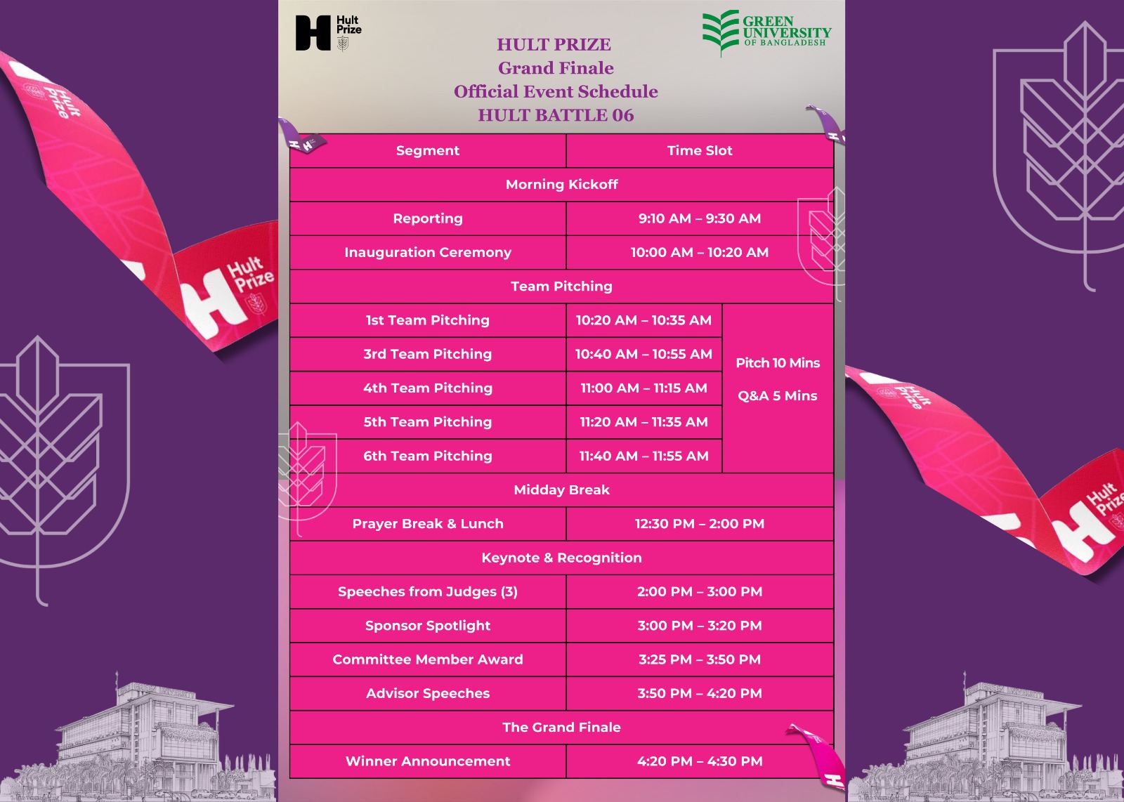 We are delighted to invite you to Hult Battle–6, organized by the Hult Prize Green University of Bangladesh. The grand finale will commence at 10:00 AM, followed by the prize-giving ceremony from 2:00 PM to 4:20 PM on February 16, 2026, at the Multi-Purpose Hall.